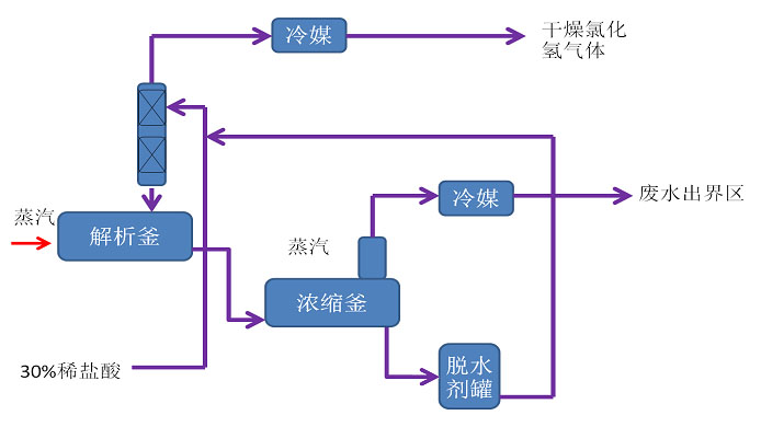 利用蒸汽作為熱源,在鹽酸中加入脫水劑進(jìn)行破共沸精餾,氣相經(jīng)冷凝、干燥可得到含水量極低的氯化氫干氣。